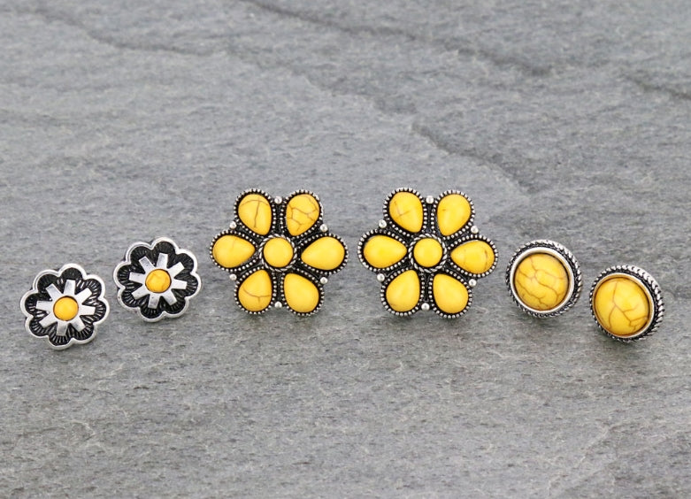 Add a splash of southwestern charm to your look with this 3 Pair Western Turquoise Earring Set. Perfect for mixing and matching, these vibrant turquoise earrings bring a playful pop of color and a touch of desert spirit to any outfit. Whether you're dressing up or keeping it casual, these earrings are your new go-to for effortless style and fun flair.