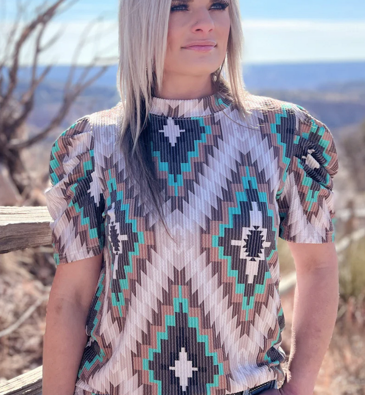Experience the joy of coming home with our All Roads Lead Home Top! Featuring a playful Aztec design and short bubble sleeves, this top will always remind you that no matter where life takes you, home is where the heart is. Perfect for any adventure or everyday wear.