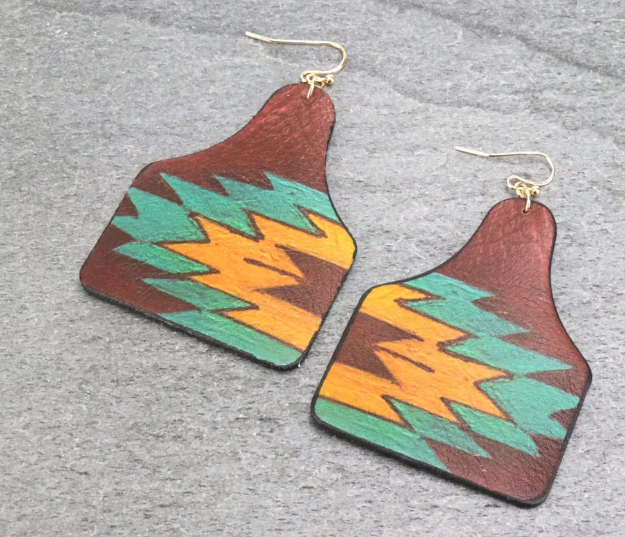 Aztec Printed Cattle Tag Leather Dangle Earrings