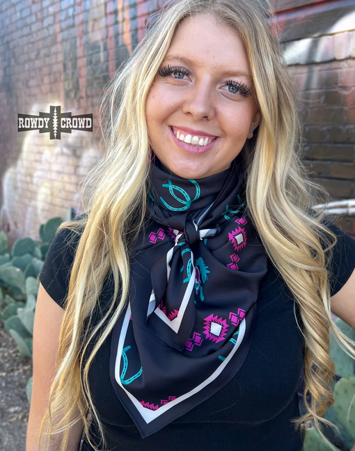 Add a playful touch to your western wardrobe with our Bunk House Wild Rag/Scarf! Featuring a bronc rider design in fun colors of black, teal, and pink, this scarf is the perfect accessory for any quirky cowgirl or cowboy. Giddy up and grab yours today!