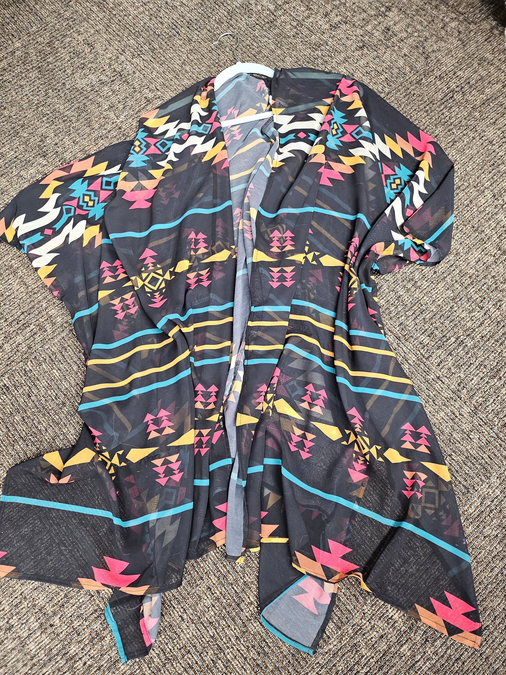 Light-weight long, mesh duster with bright colorful cacti print on a black base.