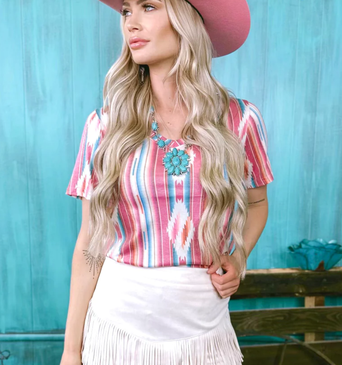 Stay cool and stylish in the Frio River Top! This unique top features a faded v-neck and a striking serape/aztec design that will have you standing out from the crowd. Perfect for any summer adventure, this fashionable piece packs a ton of style into a lightweight fabric, just add your favorite denim and you'll be ready to go!