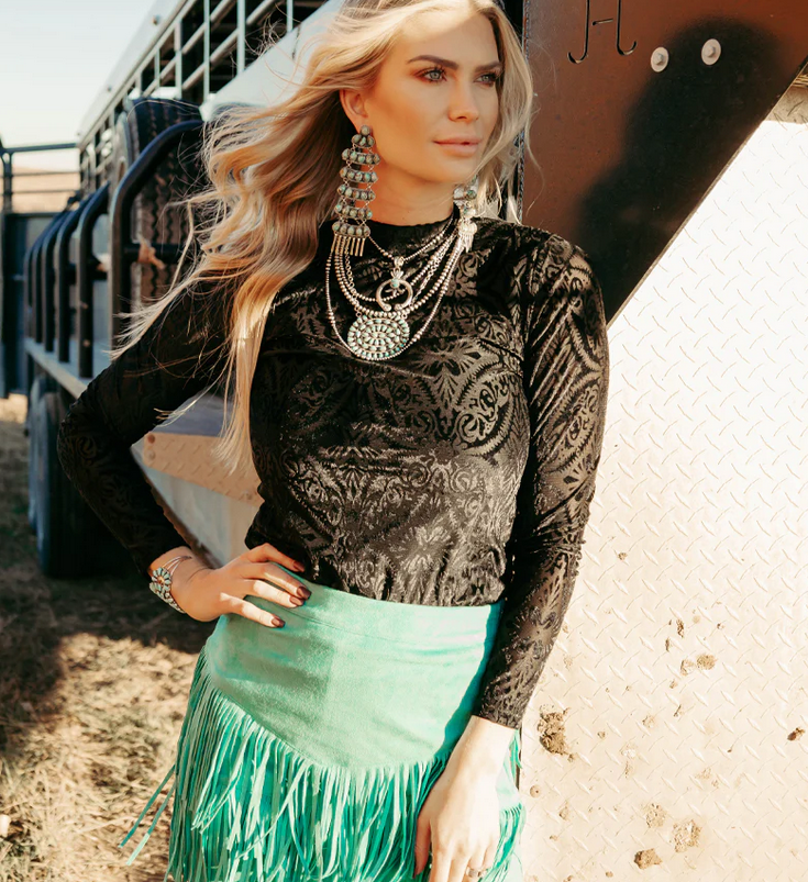 The Alcatraz Top is a stylish way to beat the chill. The long sleeve mesh top is made with velvet paisley design, offering a cozy look that'll turn heads! Wear this top and you'll be the talk of the town!