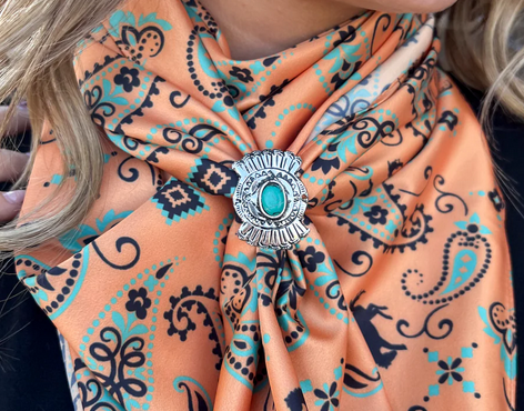 Add a pop of color to your outfit with the Turnpike Scarf Slide. This unique accessory features an Aztec-inspired design with a touch of bling and vibrant turquoise. Perfect for adding a playful touch to any scarf and your wardrobe.