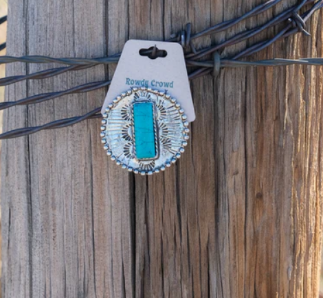 This stunning Uvalde Scarf Slide/ Ring adds a touch of southwestern flair to any outfit. Crafted of silver with a turquoise centerpiece and intricate engravings, this adjustable accessory is the perfect way to add a touch of style and class. Make a statement with Uvalde.