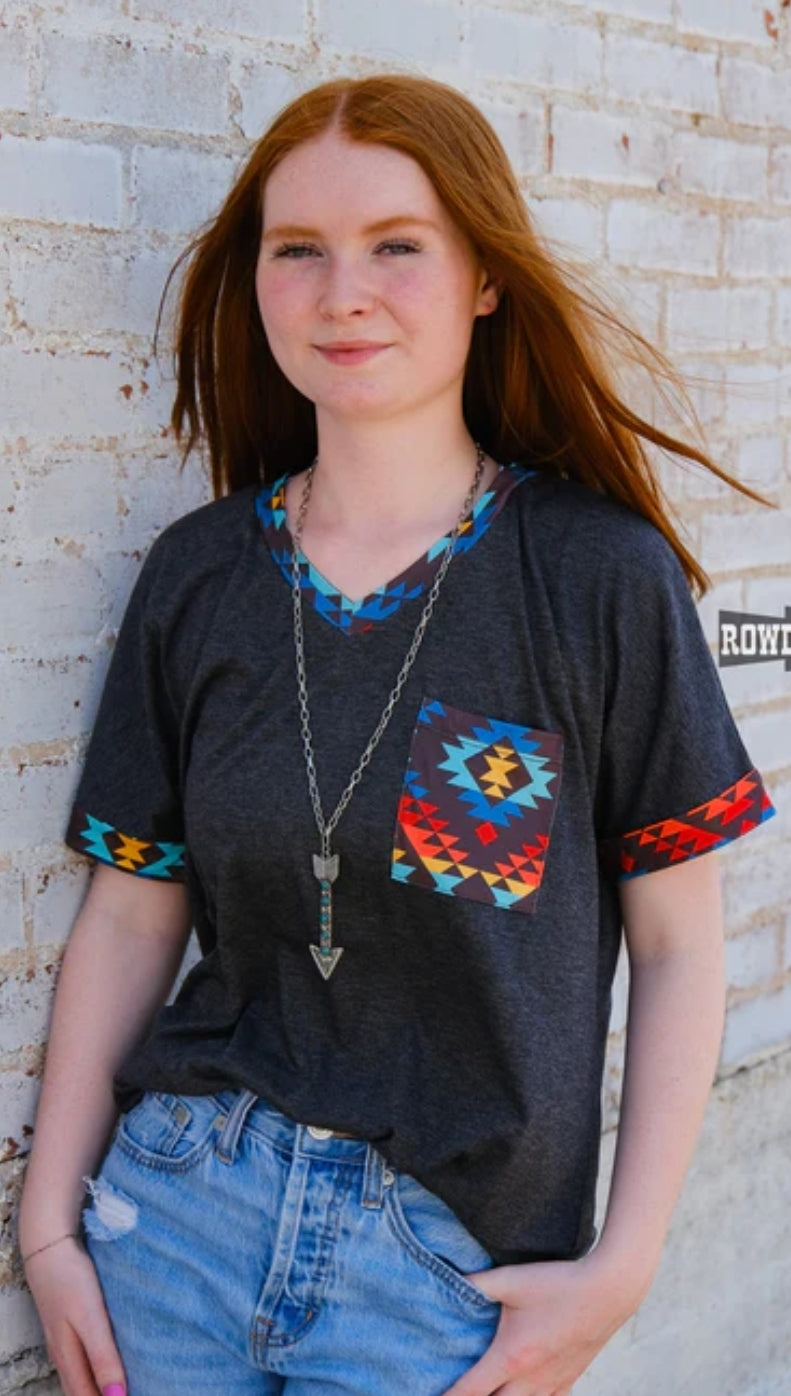 The Vaquera V-neck Tee is a comfortable dark gray tee with aztec print detailing along the collar, cuffs, and pocket. It is a true to size unisex fit, with a soft, stretchy, lightweight material!