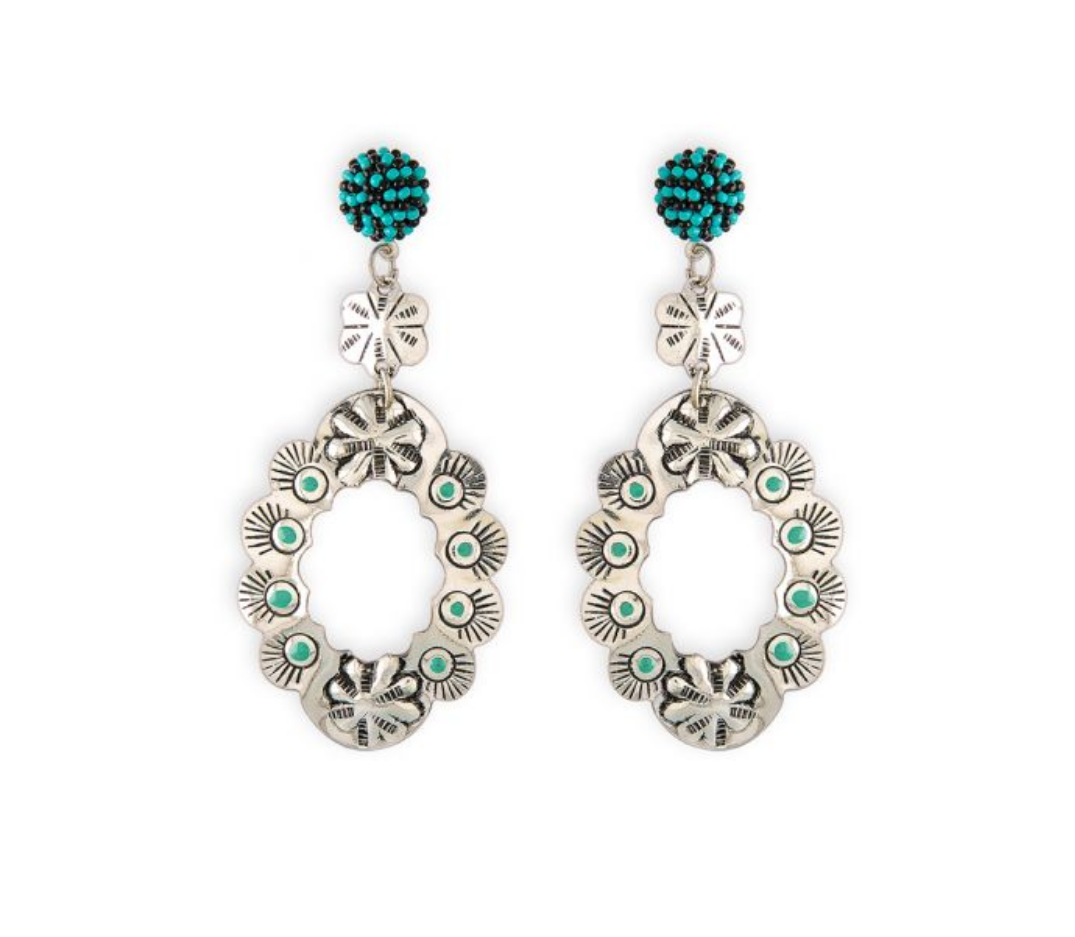 These distinctive earrings feature a beautiful and harmonious artisan design, with turquoise-toned bead accents. They will make a beautiful addition to your jewelry collection.