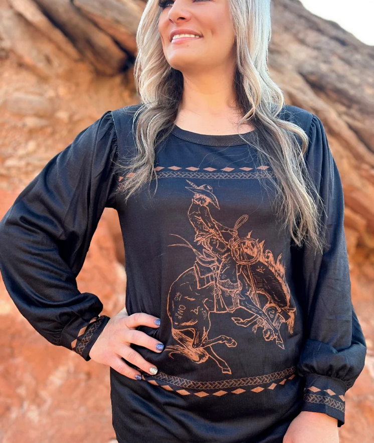 Introducing Western Hot Seat Top Black - a versatile and stylish long sleeve knit top! The striking brown design featuring a cowboy on a bronc adds an edgy touch, while the back and bottom sleeve designs elevate the look even further. Show off your western flair with this must-have piece!