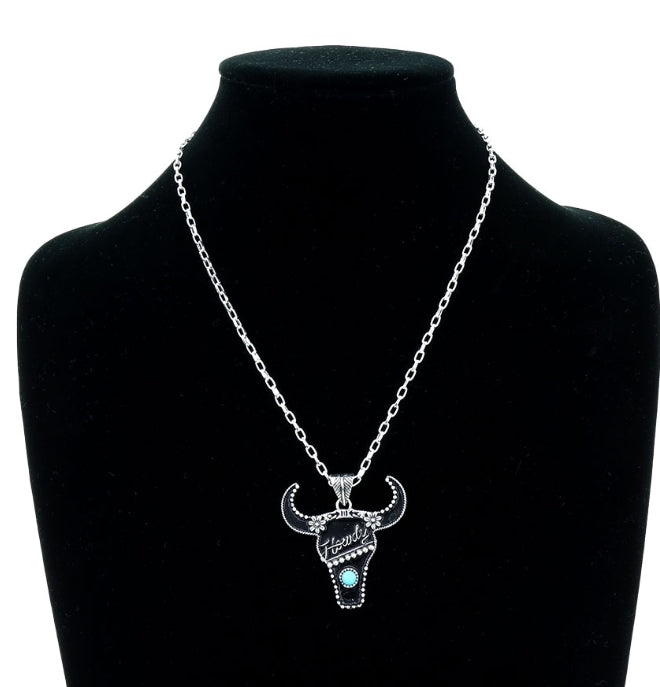 With our Western Howdy Steer Skull Necklace, show off your unique style and love for the west! Featuring a beautifully crafted steer skull pendant, this necklace is the perfect accessory for any cowgirl or cowboy. Handmade with quality materials, it is sure to make a statement and add a touch of rugged charm to any outfit.