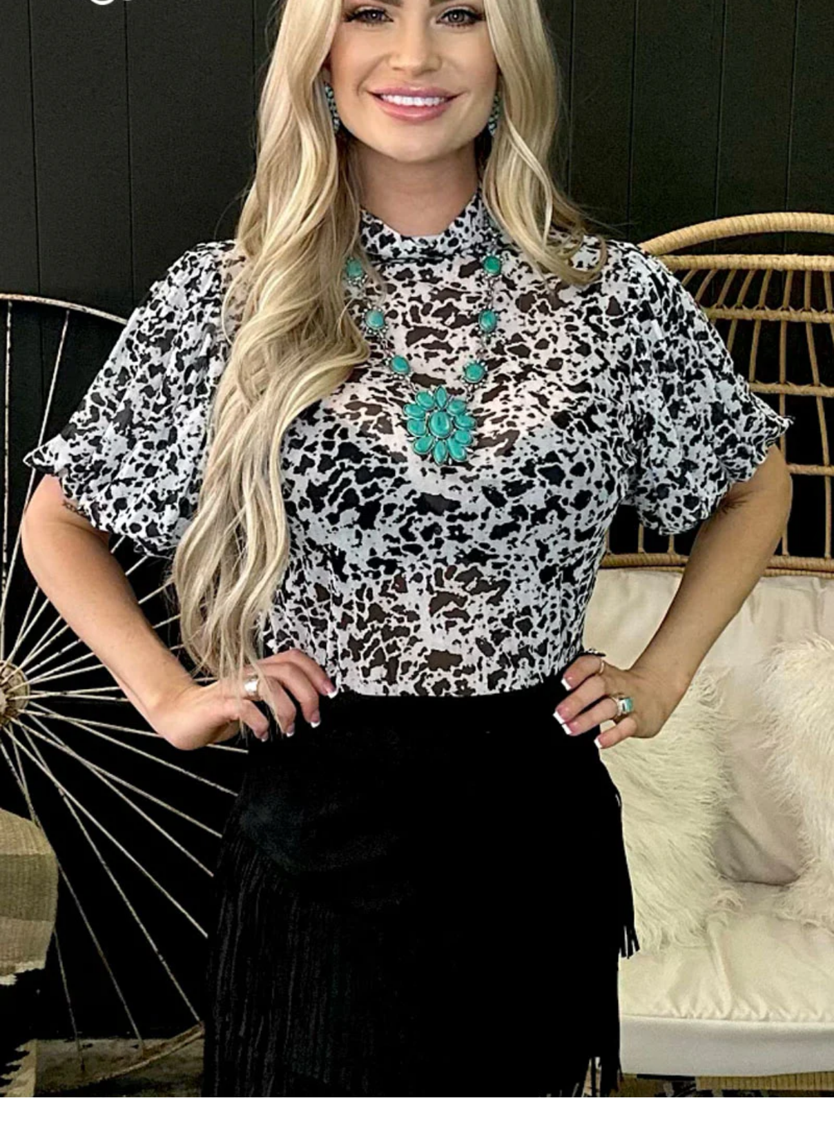 Be elegant with this comfy-cozy YOU NEEDED ME TOP! Featuring adorable cow print and bubble sleeves, you'll be bovinely stylish in no time! No mooooo-ds allowed! (wink wink).